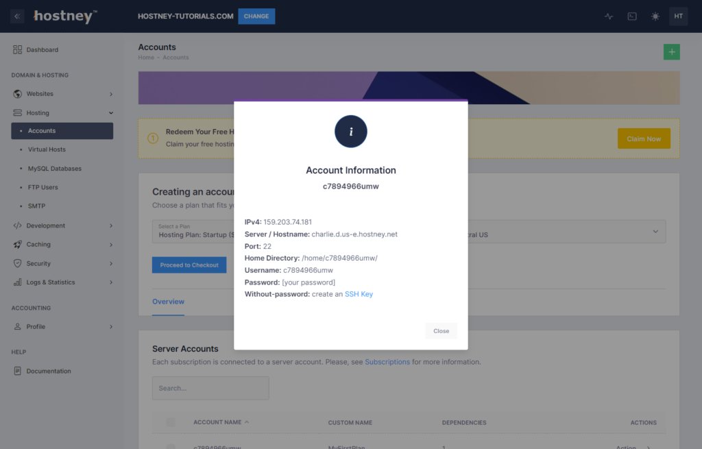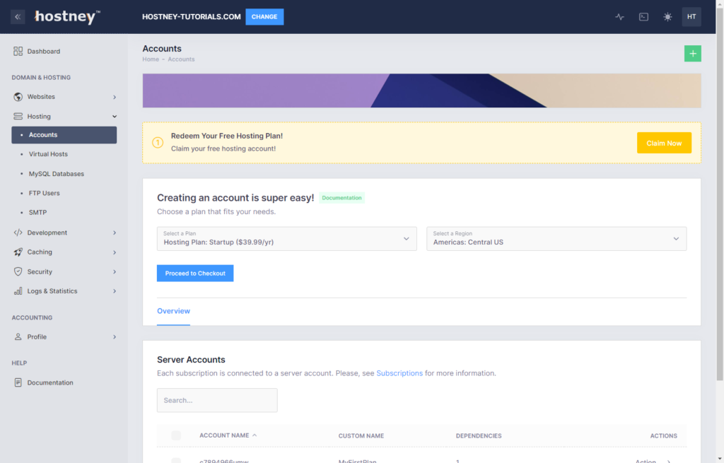 Once you have your credit card on file, go to “Accounts” and claim your trial hosting.