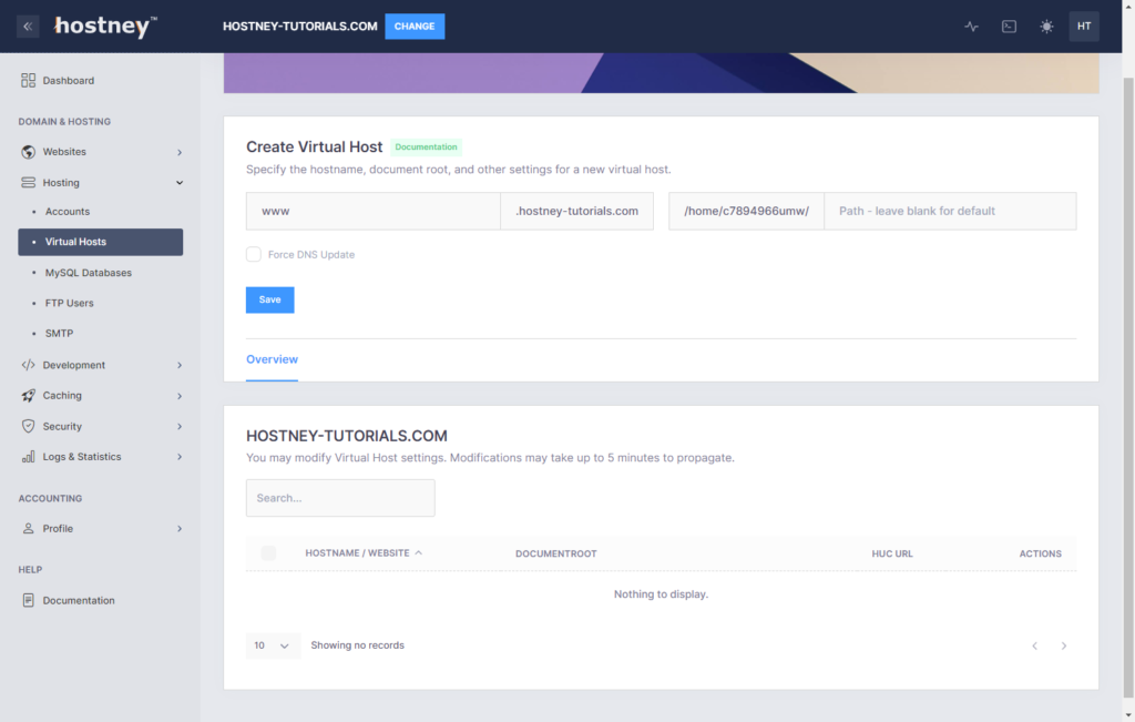 - Click on the “Save” button to create the virtual host.