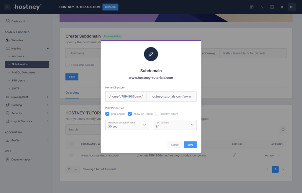 To do so, simply locate the desired “Subdomain,” proceed to the “Action” tab, and click on “Edit.” From there, you can select the desired PHP version and save your changes. Please note that it may take a moment for the configuration to update.